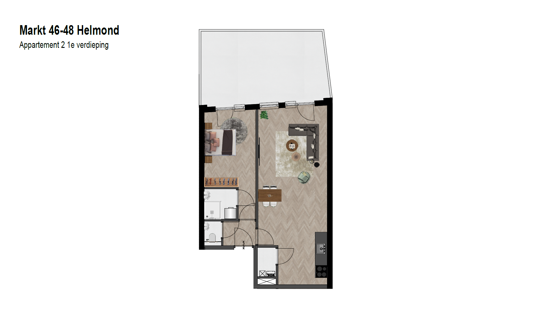 Het gehele appartement is luxueus afgewerkt met glad stucwerk wanden en plafonds. In woon- /keukengedeelte, hal en slaapgedeelte liggen pvc vloeren in houtlook. In de badkamer en het toilet zijn de wanden voorzien van tegels en de vloeren van een gietvloer. In de badkamer bevindt zich de aansluiting voor de wasmachine.